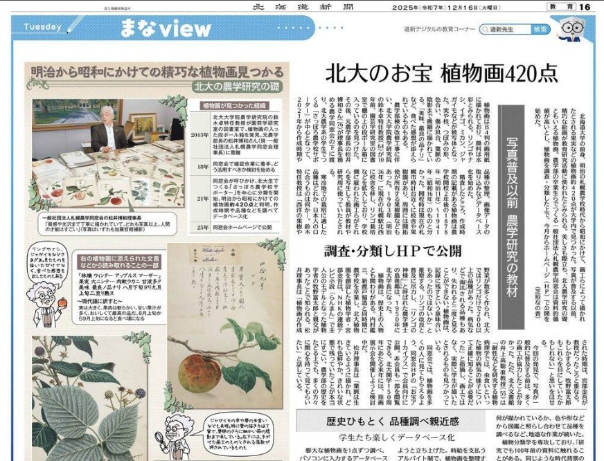 札幌本部 2025.12.16 道新に「植物画」の記事 2025年12月16日付け北海道新聞教育面に、当会の「お宝アーカイブス発掘発信プロジェクト」の「植物画」の活動を紹介する記事が掲載されました。 見出しは「北大のお宝 植物画420点」「調査・分類しHPで公開」「明治から昭和にかけての精巧な植物画見つかる」など。見事な筆致の果実や葉の絵の写真も掲載されました。 松井理事長や久田事務局長、農学部の鈴木卓教授、大学文書館の井上高聡准教授、さっぽろ農学校サポーターの石川弘晃さんにも取材し、ていねいにプロジェクトの経緯や内容を伝えて下さっています。 取材に当たられた芝垣なの香記者と加藤哲朗カメラマンはじめ、北海道新聞社に感謝申し上げます。 同社の著作権を尊重するかたちで、紙面の全部ではなく、一部コピーを掲載させていただきました。 (事務局)